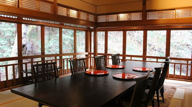 大阪の中でも紅葉の名所として名高い箕面。箕面大滝まで続く道は、秋の紅葉はもちろん、新緑の季節、夏の茂った緑や蛍の姿、冬には澄んだ空気の中を雪が舞い、四季おりおりの顔を見せてくれます。そんな美しい渓流沿いに佇む一汁二菜うえの箕面店。築100年の料亭旅館を改装した店内には箕面川を見下ろした個室や離れなど、様々なお部屋で伝統的な会席料理が味わえます。箕面店では、旬の食材を用いた繊細な料理の数々でおもてなしをいたします。