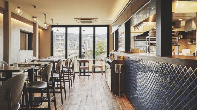 店内は穏やかな鴨川を望みながら、リラックした気分で料理を楽しめる空間が広がっています。アメリカンスタイルの料理を味わいたい、そんな方に最適なメニューを揃えています。魚メインで食べたい方は、真鯛のカルパッチョやサーモンキヌアケーキ、マグロのレアステーキをどうぞ。肉料理を食べたい方には、生産地を激選した国産牛サーロインステーキや和牛ミートボールをご用意しています。そして、食事と一緒に幅広い産地からセレクトしたワインもどうぞ。