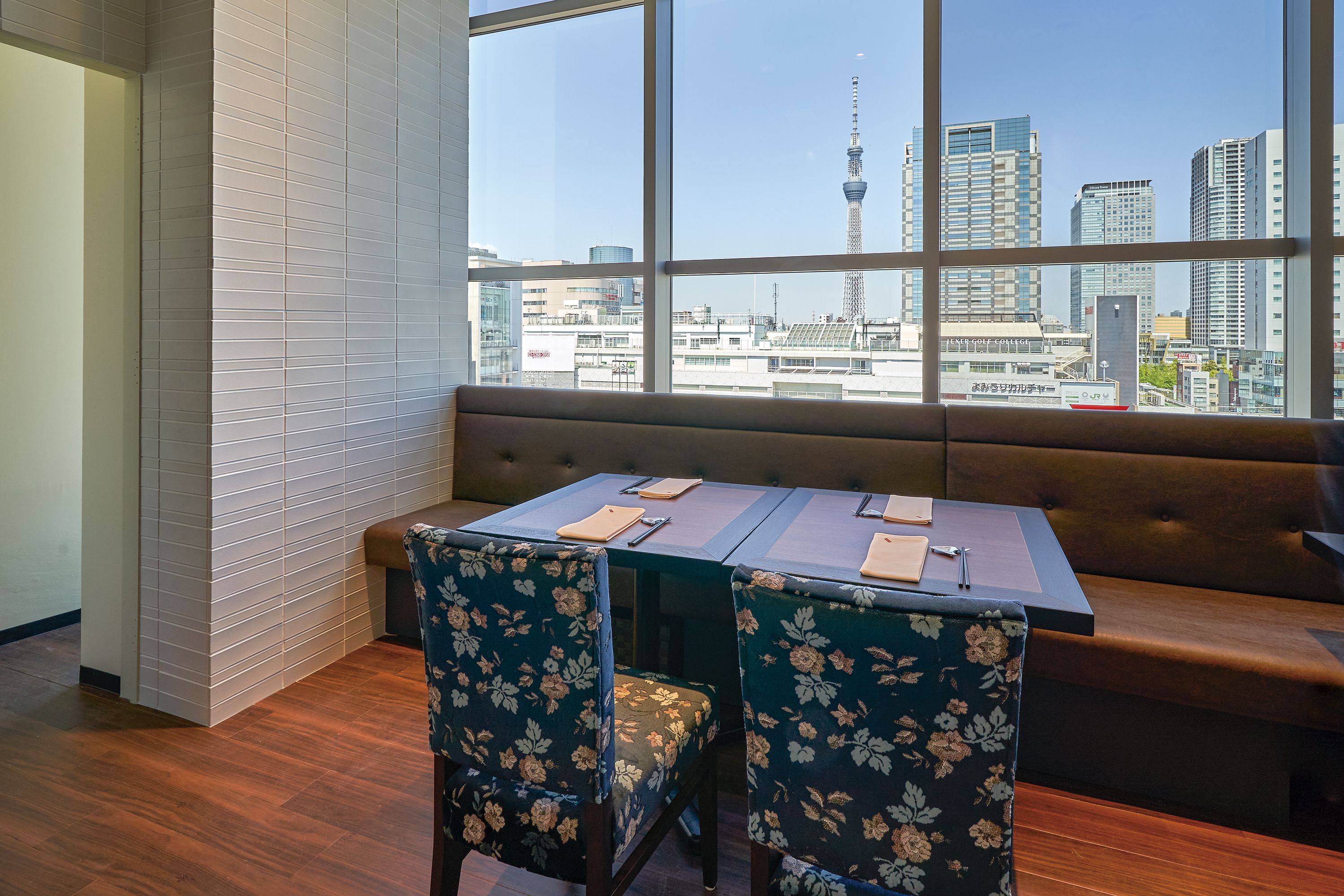 ビルの最上階に位置する広々とした窓からは、東京のシンボルツリーであるスカイツリーを一望できます。ゆったり過ごせるテーブル席と大小様々な個室をご用意しておりますので、各種ニーズに合わせてご利用ください。 本場中国から招聘した特級点心師や厨師が作る名物小籠包や四川麻婆豆腐、北京ダック、最高級気仙沼産のフカヒレといった本格派のメニューが豊富にございます。上質な素材ならではの旨みを引き出した味わい深いモダンチャイニーズとの出会いをお楽しみいただけるお店です。