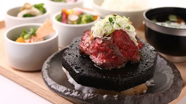 [Main Dish] ■ Black Angus Beef and Certified Yamagata Pork Steak Grilled on Fuji Lava Rocks ~Mizore Daikon Radish Soy Sauce~