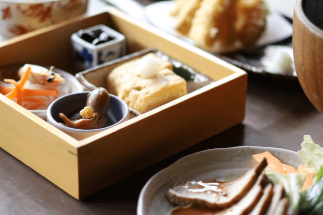 [Course Contents] - Two-tiered bento box (seasonal appetizer) - Mushroom and duck hotpot (Jumbo nameko mushrooms, spaghetti mushrooms, sliced domestic duck, domestic duck meatballs, Kujo scallions, and Kyoto-style tofu from Hattori Tofu) - Soba noodles (Served with the hotpot broth.) - Dessert