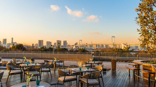 With a panoramic view of Tokyo Bay, the dining experience here differs as the scenery changes during the day. During spring and autumn, you can sit at the open-air terrace and feel the refreshing wind as you enjoy your meal. Be treated to dishes made from the freshest ingredients such as beef sirloin from Australia or grilled chicken breast. Small bites or desserts are available for takeaways.