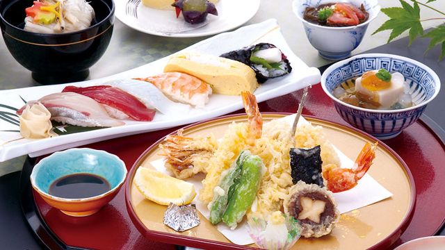 店内は落ち着いた雰囲気の空間で、プライベートな時間をお楽しみいただけます。テーブル席からは滝を望む庭園を堪能できるのが魅力。鹿児島の旬の食材を活かしたメニューを豊富に取り揃えています。黒毛和牛陶板焼きや天麩羅、薩摩黒豚しゃぶしゃぶなどに加え、季節の食材を使った前菜や吸い物などをご用意。お食い初めや餅踏みセットも準備しているので、お子様のお祝いにもご利用いただけます。