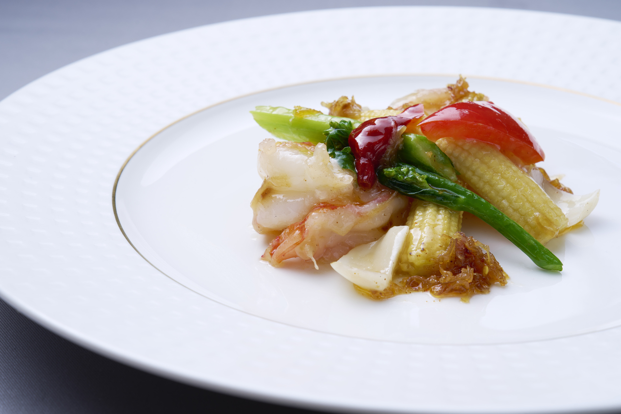「蟹肉とフカヒレ入りとうもろこしのスープ」、二種の海鮮を一皿で楽しむ「鮮魚と天然海老の二菜仕立て」をはじめとした8品のコース