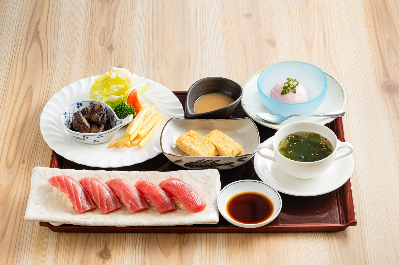 玉子焼き 牛バラ網焼き ポテトフライ ミニサラダ まぐろ握り 若布スープ