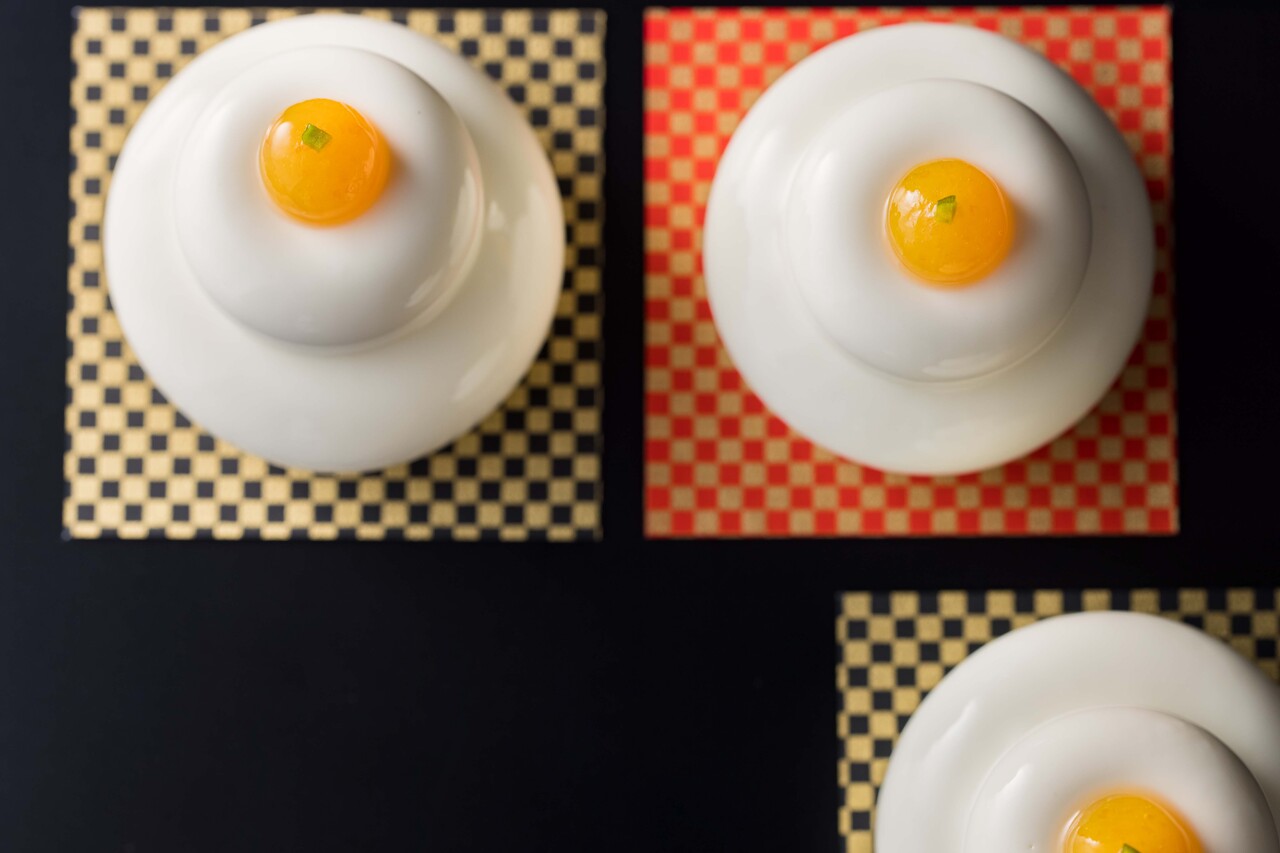 代表的な正月飾りを愛らしく表現した新春スイーツ。艶やかで純白の甘酒ムースの中には柚子モチや抹茶のガナッシュ、和三盆の生地を織り込み、上には金柑のコンフィチュールを添えました。