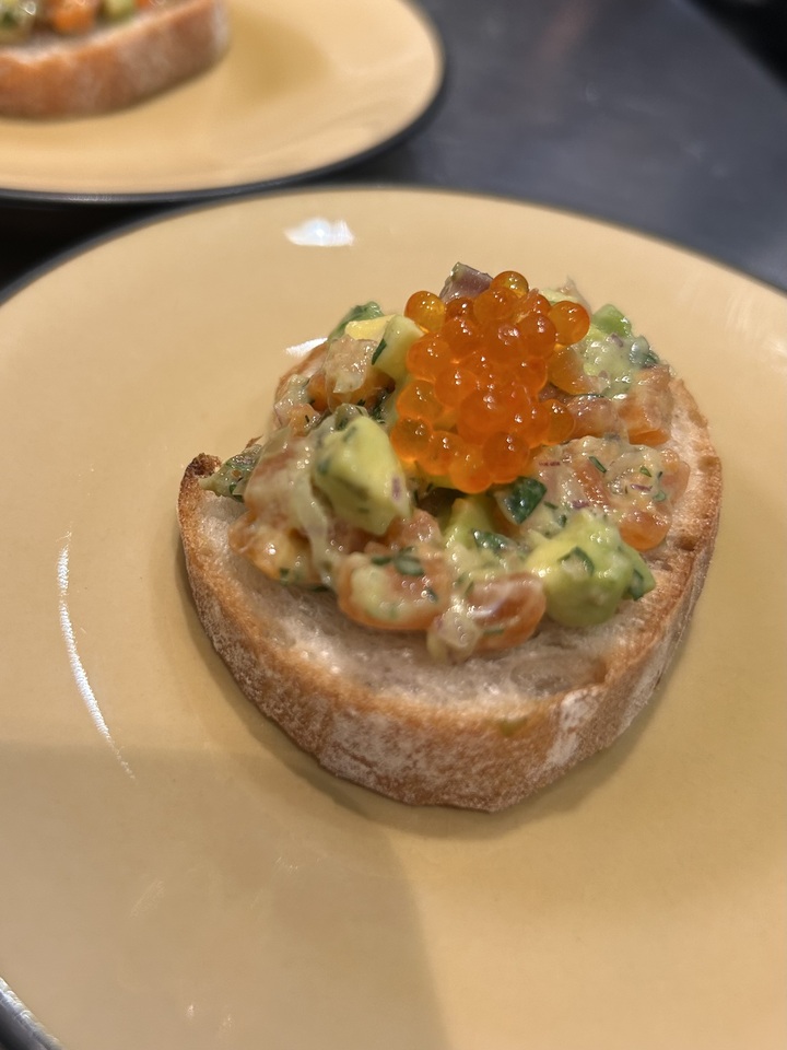 Appetizer: Homemade smoked salmon and avocado bruschetta