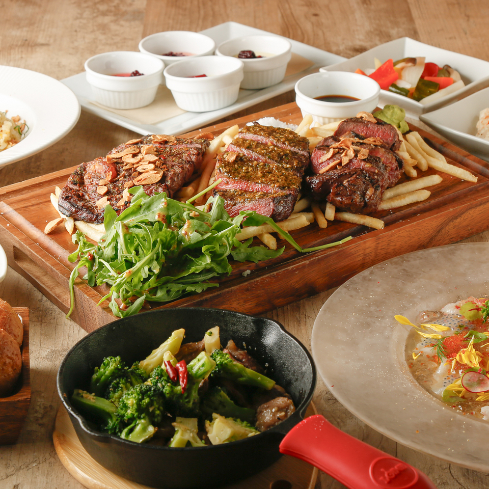 料理は《季節の前菜3種》にはじまり、季節のカルパッチョ、彩り豊かなサラダやシラスと九条ネギのガーリックライス【《料理長お勧めお肉料理盛り合わせ》などお料理全7品を【ゆったり3時間飲み放題付き】でお楽しみ頂けます。