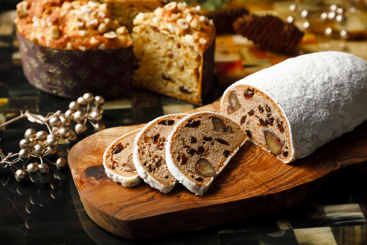[天草晩柑のパネトーネ]当ホテル特製のパネトーネは、福岡県産のこだわりの小麦と自家製天然酵母を使用し、熊本県産天草晩柑の贅沢なペーストを練り込み、ふんわりと焼き上げました。ヘーゼルナッツやマカロン生地でアクセ