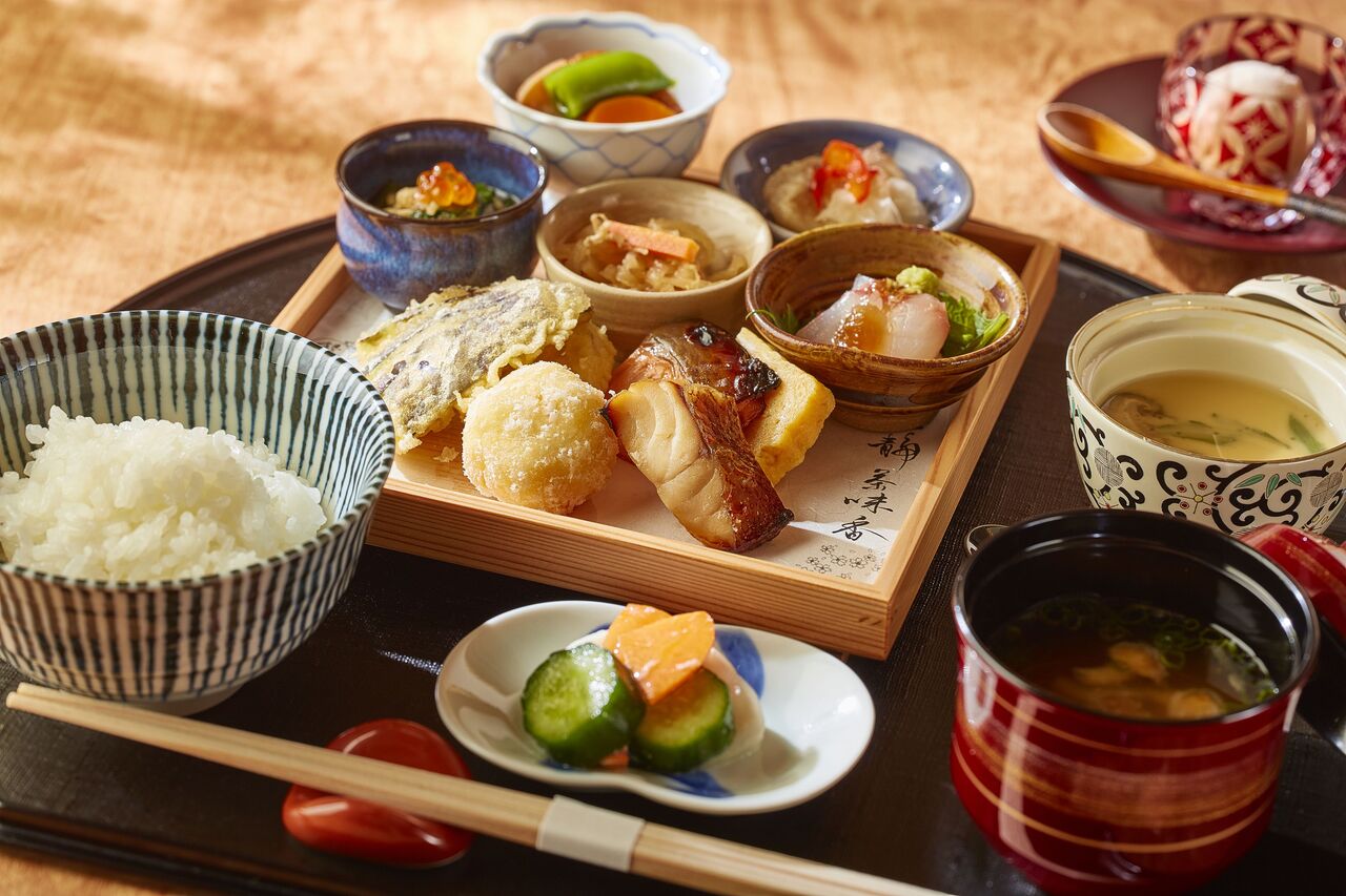 - Salmon pickled in sake lees, Nanbanzuke young sweetfish, horse mackerel namero, Nanban shrimp daikon, vegetable tempura, simmered eggplant, sesame dressing, kinpira, tamagoyaki (Japanese omelette), chawanmushi (steamed egg custard)