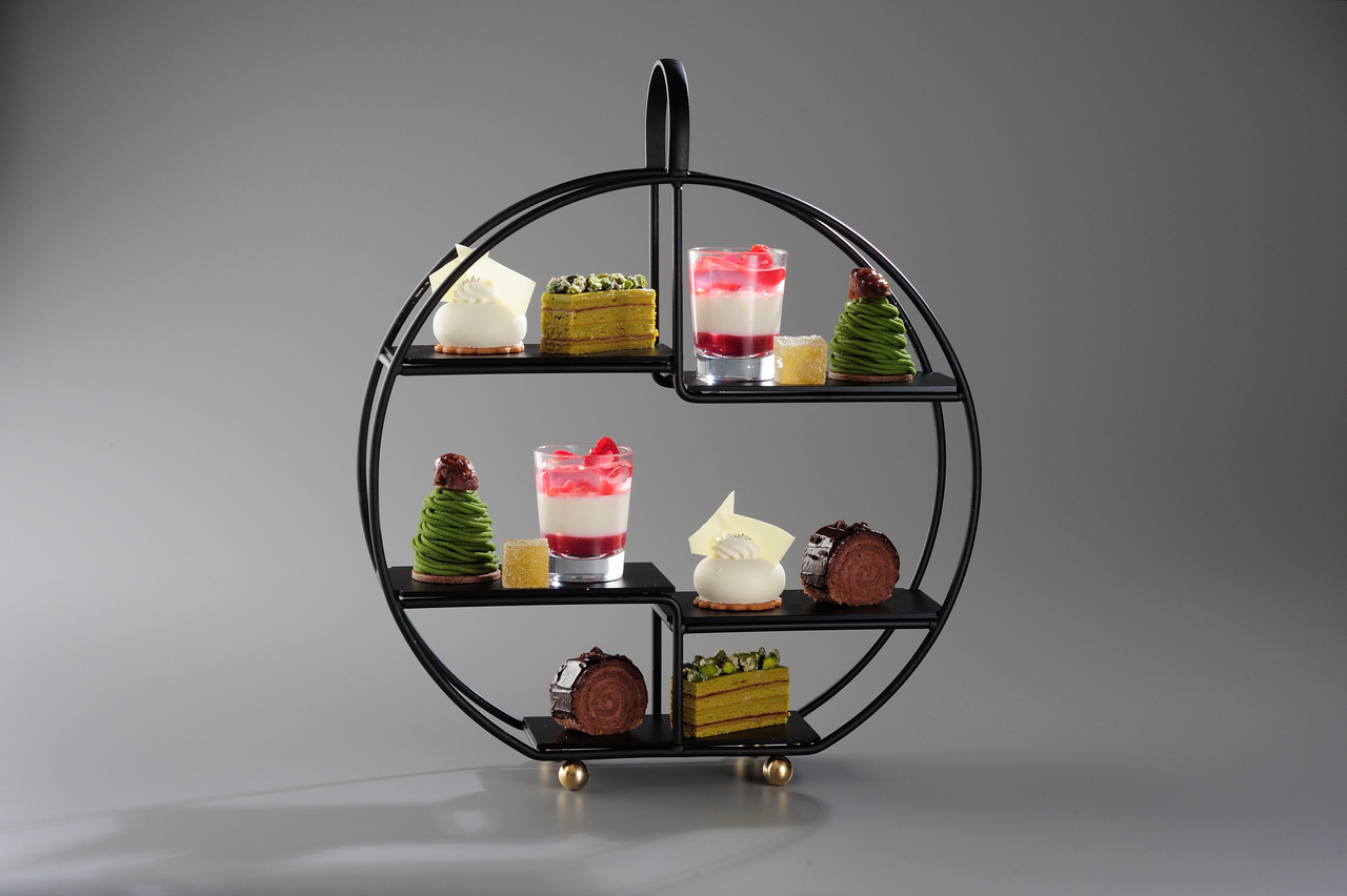 A single bite capturing Okayama muscat grapes tightly sealed in a pâte de fruit. The pistachio gâteau and matcha Mont Blanc are fragrant with a vivid green that evokes a forest. The chocolate roll cake is styled like a tree stump, while the white chocolate resembles fresh snow… and the coconut verrine might just be Santa Claus? Coffee or tea is included as part of the set.