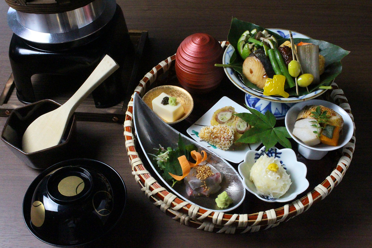 約15種類の季節の旬を一籠に詰め込み、炊き立ての釜ご飯と一緒にお召し上がりいただけます。