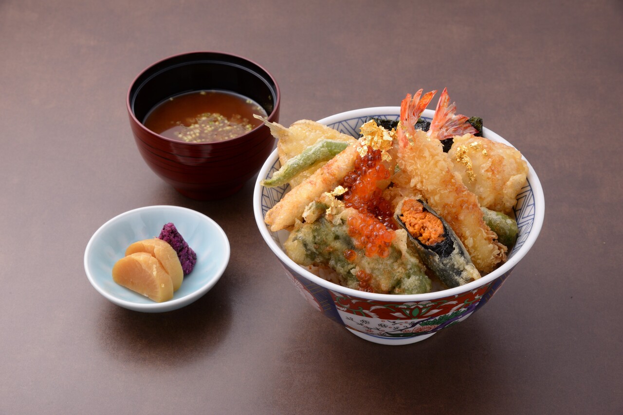 Luxurious tempura rice bowl with the famous sea urchin wrapped in seaweed.