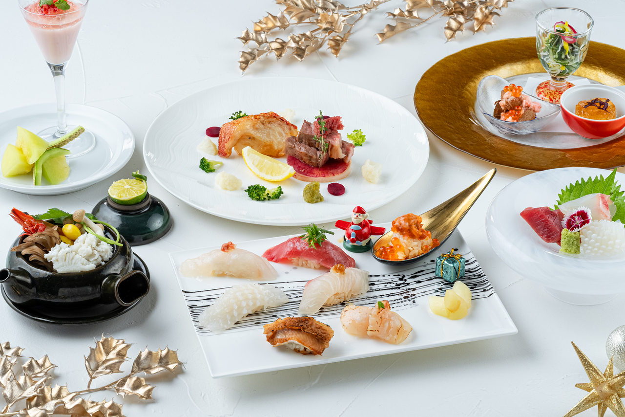 Sushi Afternoon Tea with "Japanese Beauty" as a theme - spend a blissful moment while looking at the superb view 123m above the ground. This is a very special lunch where you can enjoy both Tomozuna's sushi and sweets.