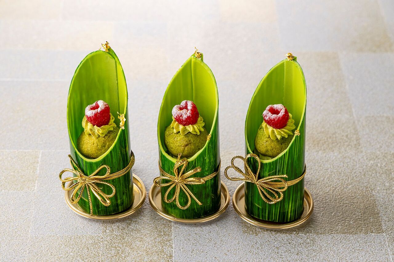 "KADOMATSU," a sweet that embodies the Kadomatsu (New Year's pine decoration) that brings good fortune in the new year, is an eye-catching treat presented in a bamboo-shaped white chocolate container. The container is adorned with a traditional religieuse confection, and the choux pastry is filled with a fragrant, smooth cream made from Kyoto-produced Uji matcha, Felchlin Opus White 35%, sake lees, and custard. Furthermore, the cream is layered with quince and pear confiture, creating a harmonious blend of elegant sweetness, subtle fragrance, and refreshing fruitiness, creating a rich, lingering finish. This sweet, which will add a touch of elegance to your New Year's table, is perfect for gathering with family and friends, as well as for New Year's greetings and as a gift for loved ones.
