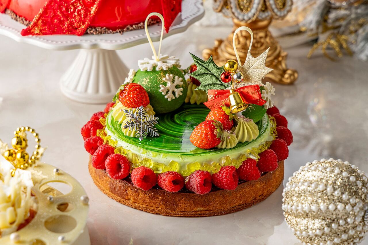Strawberry and red currant white chocolate mousse is layered with pink grapefruit jam and Valrhona Manjari 64% ganache, characterized by its red fruit-like tartness and refined bitterness. The toasty almond and rich buttery pain de jène is paired with crispy feuillantine, creating a harmonious blend of textures and flavors. The lustrous crimson chocolate coating and delicate lace decoration evoke the sparkle of the red ornaments adorning a Christmas tree.