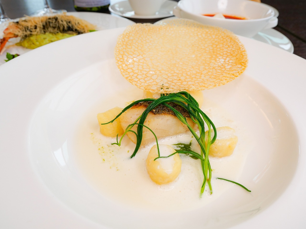 アンコウのポワレとあん肝のクロケット トマトソースと香草オイル