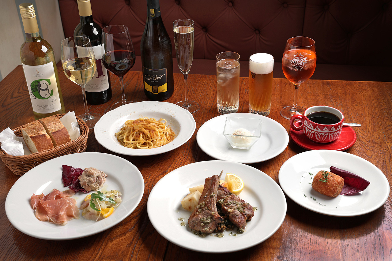 前菜盛合わせや900℃の高温オーブンで焼き上げる日替わり肉料理、ペペロンチーノ、デザートが付いたコース料理と生ビールや自社輸入のイタリアワインをお楽しみいただけます。