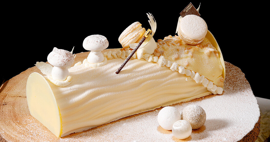 輝く雪が積もった切り株を思わせるブッシュ・ド・ノエルには、香ばしい黒ゴマビスキュイにザクザクとした柚子のチョコレートクランチを重ね、ピスタチオダックワーズ、ジンジャーレモンクリーム、ベリーのジュレを高知県産の柚子を使用した爽やかなムースで包み込みました。