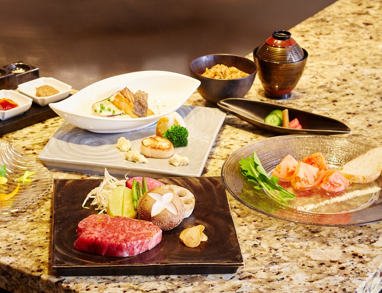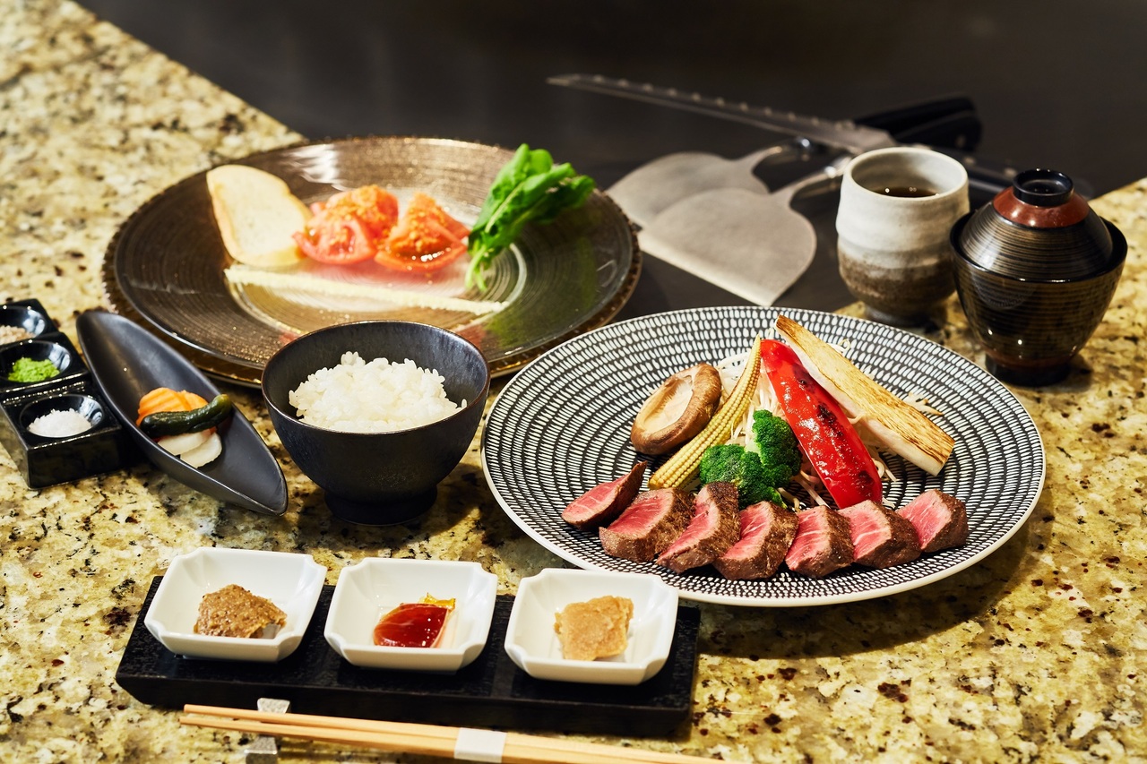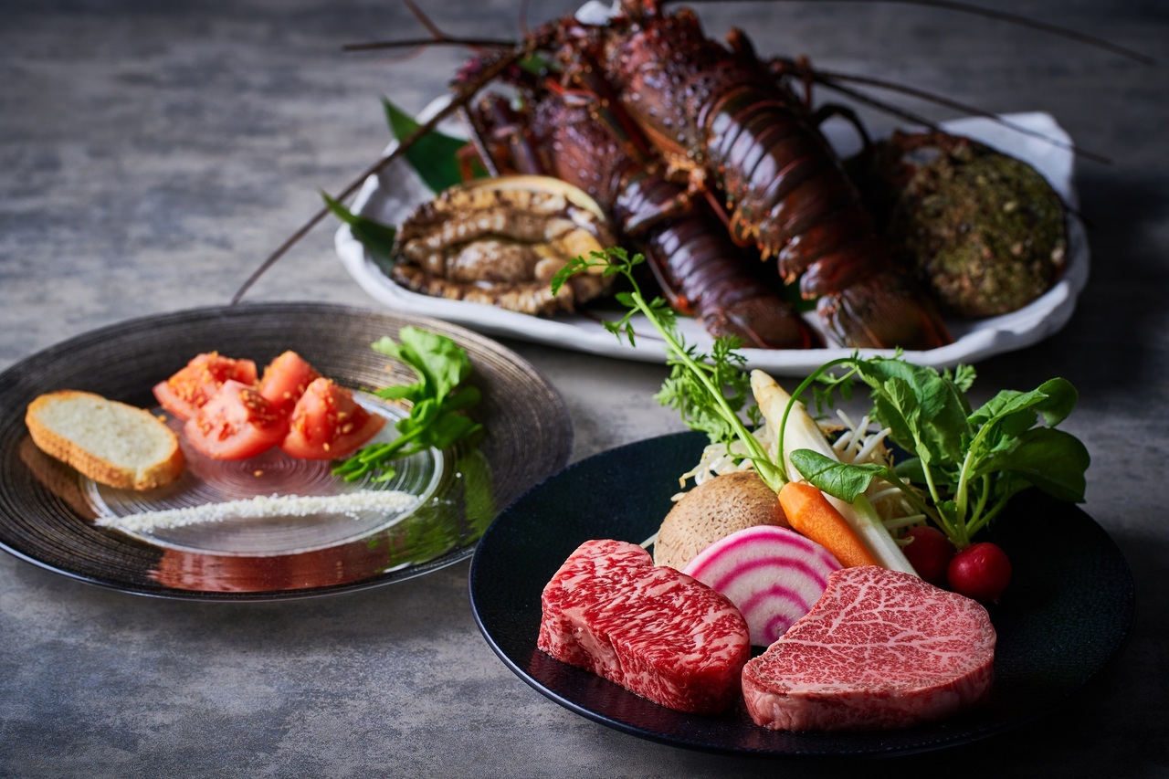おもてなしの「焼きトマト」から始まり、料理長が厳選した九州産黒毛和牛ロースと、旬の鮮魚を鉄板で丁寧に焼き上げます。