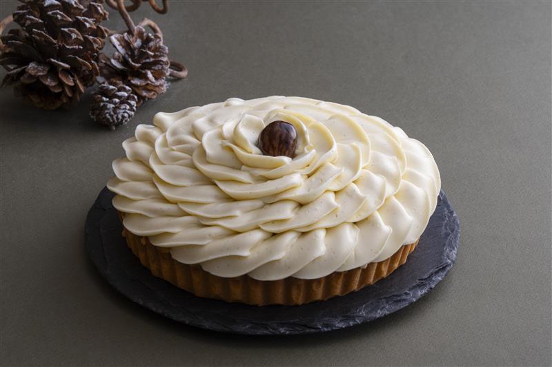 An elegant tart that beautifully combines the rich flavor of chestnuts with the gentle sweetness of vanilla cream.