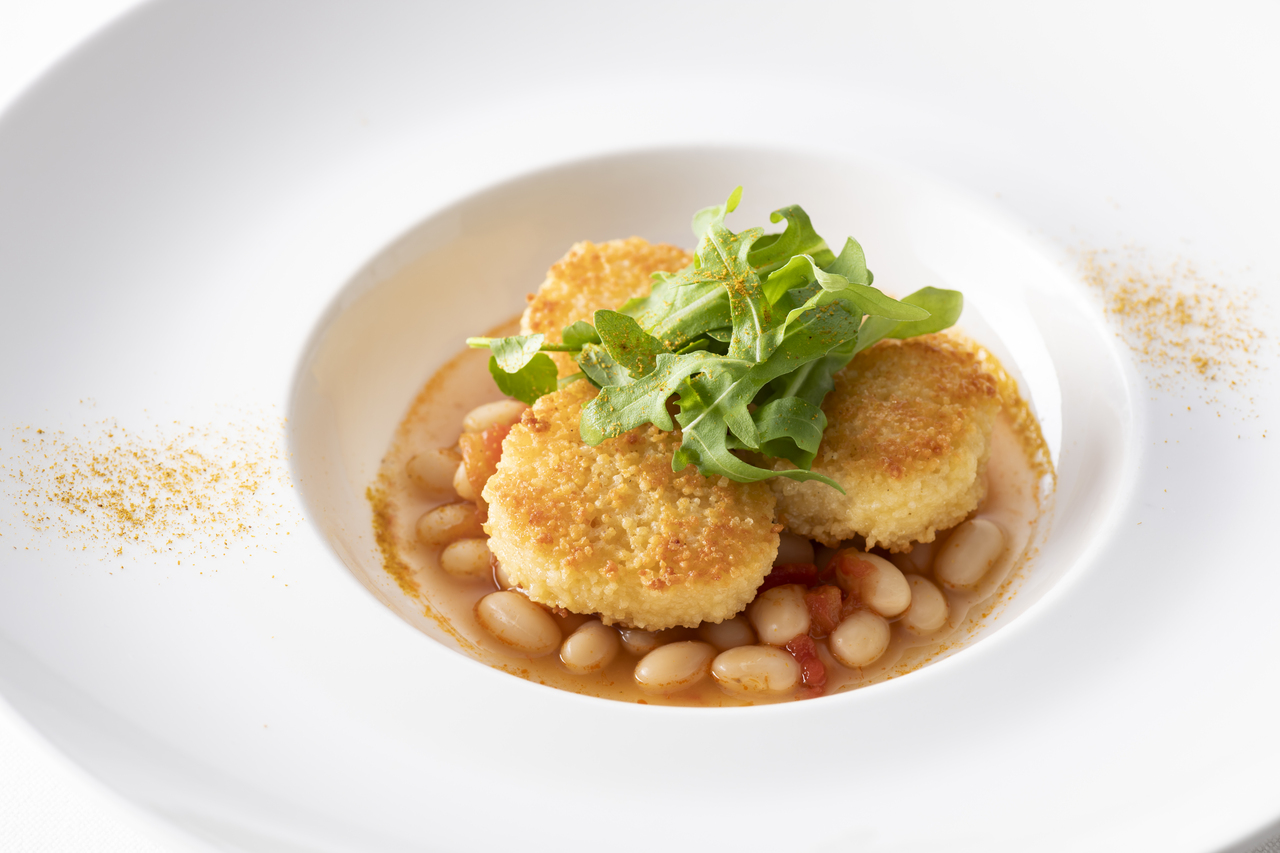 ケーキ。ロイヤルティーヌとアーモンドの生地を底に敷き、香ばしいピスタチオのムースと生地に、甘酸っぱいベリージャムを幾層にも重ねました。枯山水を思わせるケーキの上には、繊細な抹茶のチョコレートをあしらい、パリッとした食感がアクセントに。上品なピスタチオの香りとベリーの酸味が調和した爽やかな味わいは、特別な夜を優雅に彩ります。