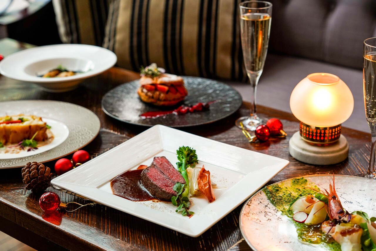 シェフが腕によりをかけて作り上げたコースは、メインの「国産牛ランプ肉のロティ」加え、食後にはクリスマス特製デザートを楽しめるフルコース。高さ5mの天井とガラス張りの開放感あふれたリゾート空間で、癒しのひとときをお過ごしください。