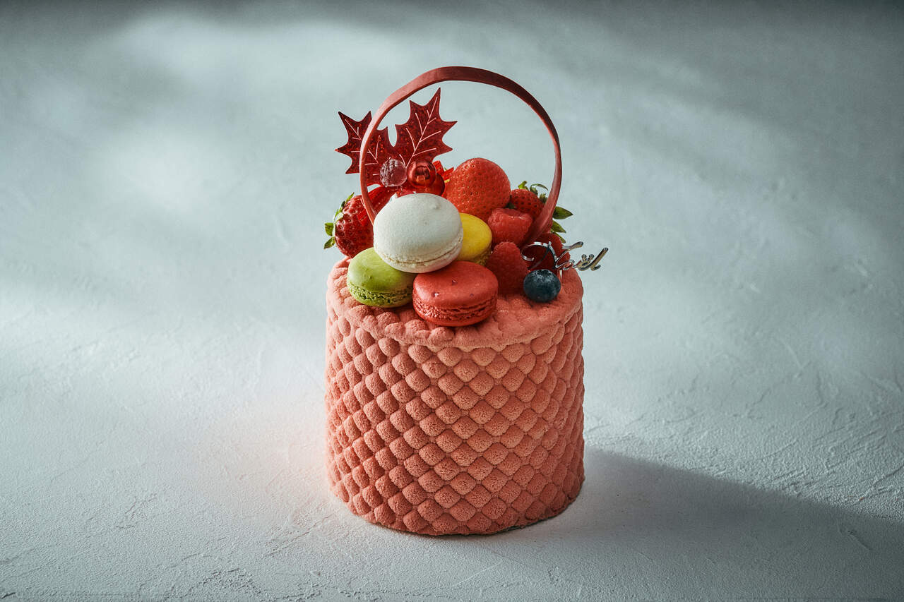 This cake, decorated with colorful macarons, is inspired by a gorgeous bag. It is layered with strawberry and raspberry jelly, strawberry cream, and pistachio ganache, and is coated in smooth French white chocolate. The base is made of "feuillantine," a French pastry made from thinly baked dough cut into flakes, adding a light and crispy texture. It is a playful dish.