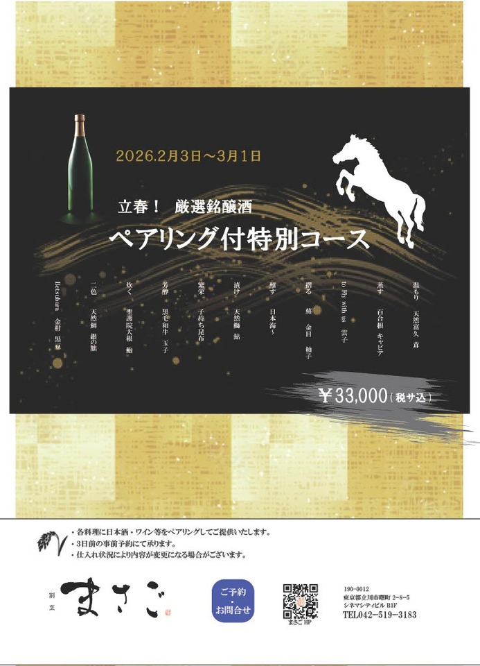 A Christmas version of the popular Masago course. Enjoy the special flavors of Kappo Masago, including a glass of champagne.