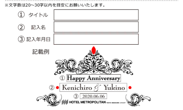 ①タイトル ②お名前(20文字以内)、③記入年月日 に入る文言をご入力ください。