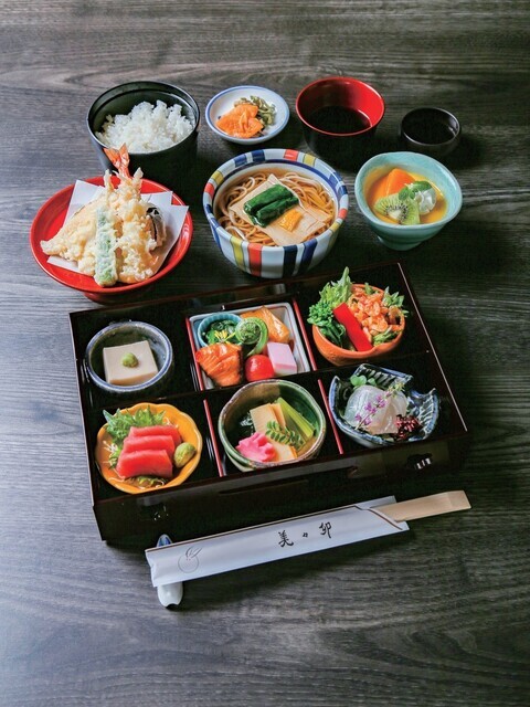 Two types of sashimi / appetizer / tempura / salad / white rice / seasonal soba or udon noodles / pickles / dessert