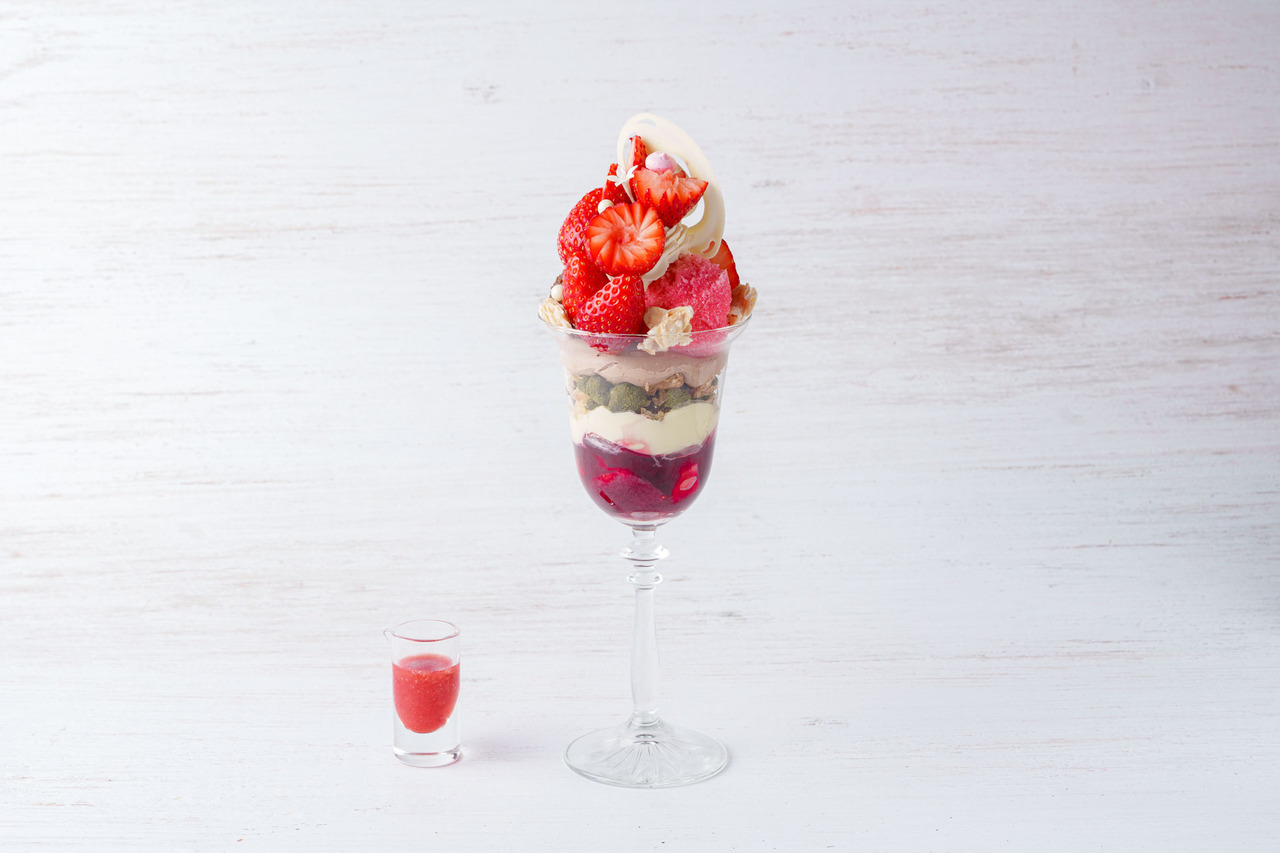 いちごの甘みを引き立てるため、ベリーのシャーベットや洋梨のアイス、ラズベリークリーム、ハイビスカスのジュレなど、味わいに変化を添える素材を丁寧に重ねました。