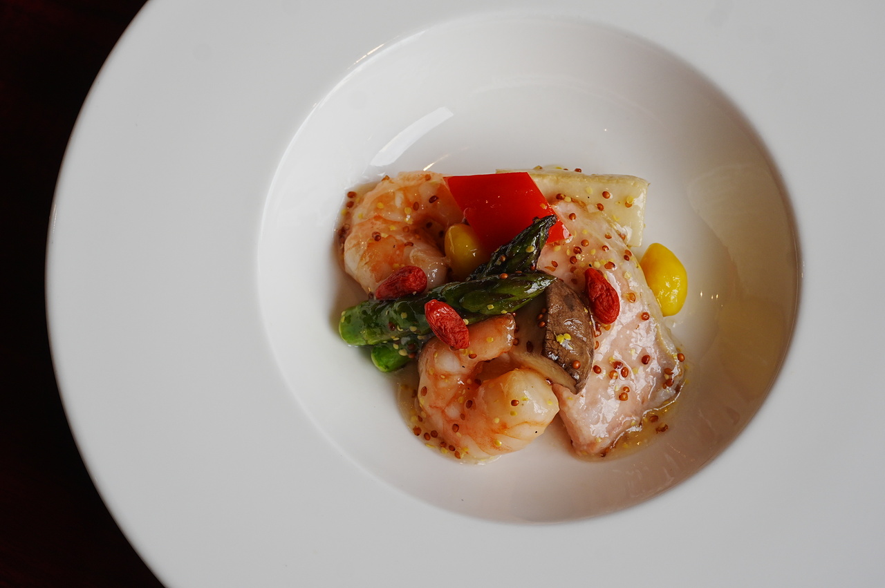 ・海老と根菜のスチーム 香味ソース