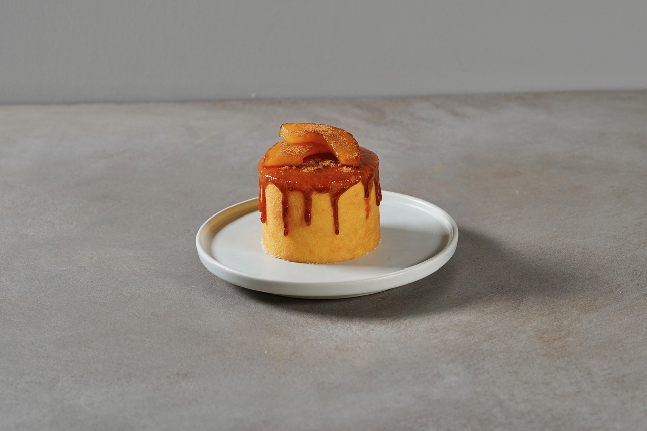 生クリームを入れたバウムの上にカスタードを入れた桃を丸ごと乗せました