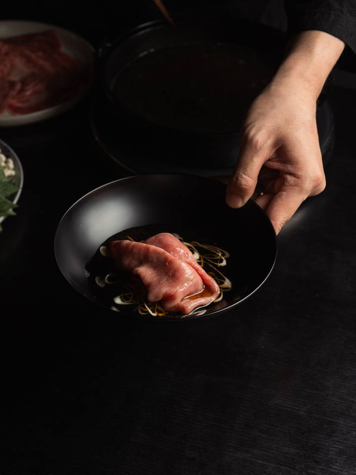 Sukiyaki: Kumamoto Amakusa Kuroge Wagyu shoulder loin → Nara Yamato Beef ribeye (¥1,980 extra per slice)