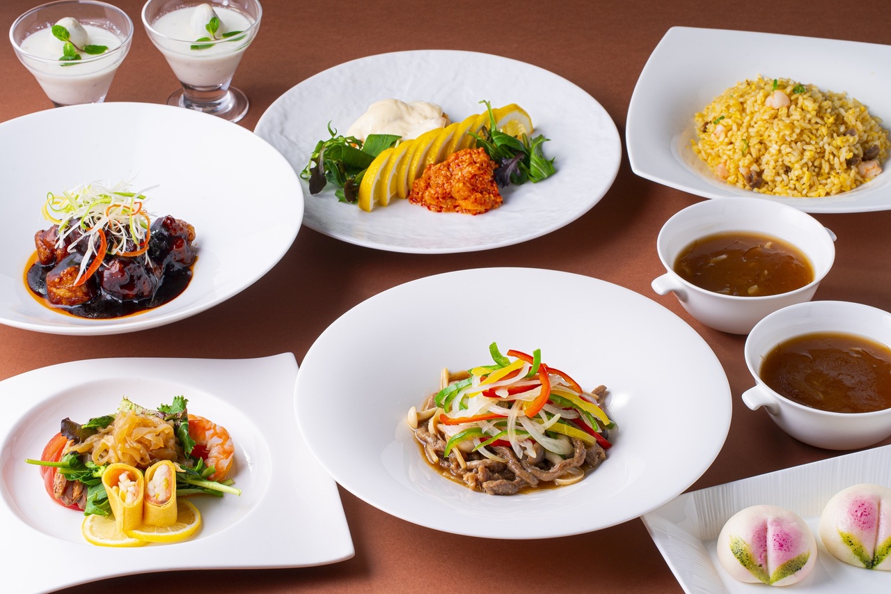 サラダ、点心2種、メイン2品、ご飯&スープ または お粥、デザート