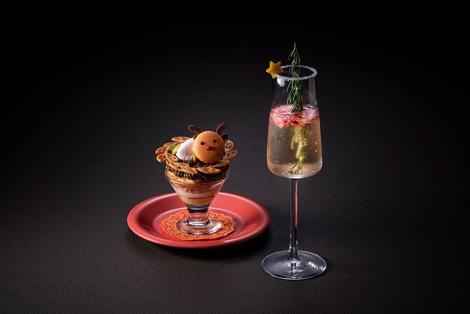 A Paris-Brest parfait with pistachio buttercream, and sparkling cocktail that balances the refreshing sweetness of lychee with the gentle artness of strawberry. Enjoy this special set full of Chritsmas spirit.