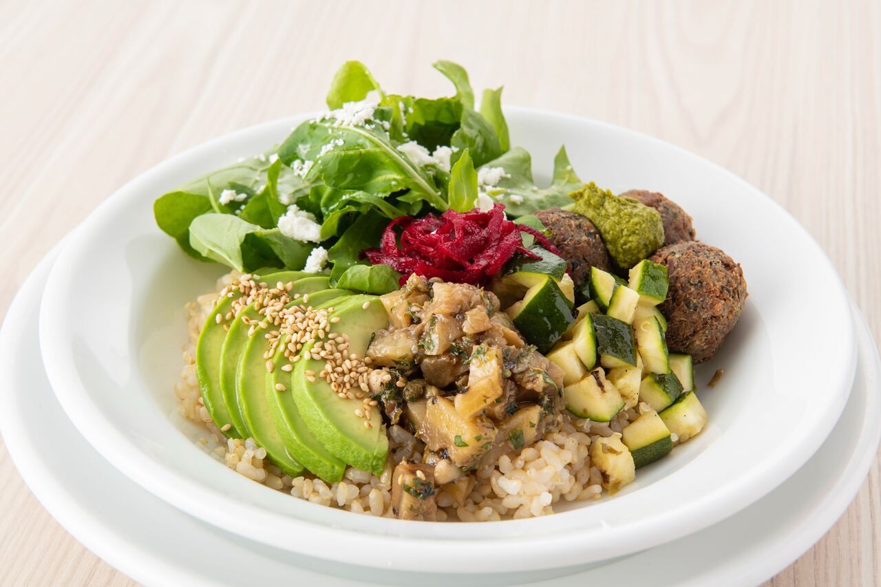 Quinoa and Brown Rice Bowl with Falafel, Grilled Zucchini, Marinated Eggplant, Avocado, Feta, and Pickled Beet