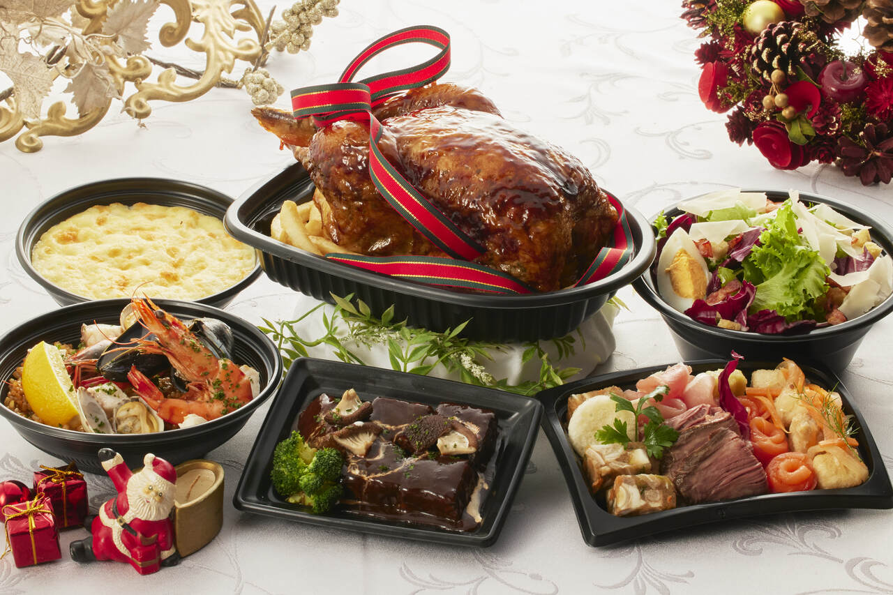 ・ローストチキン・ビーフシチュー・魚介とショートパスタのグラタン ・オードブル5種・シーザー風サラダ・魚介のパエリア
