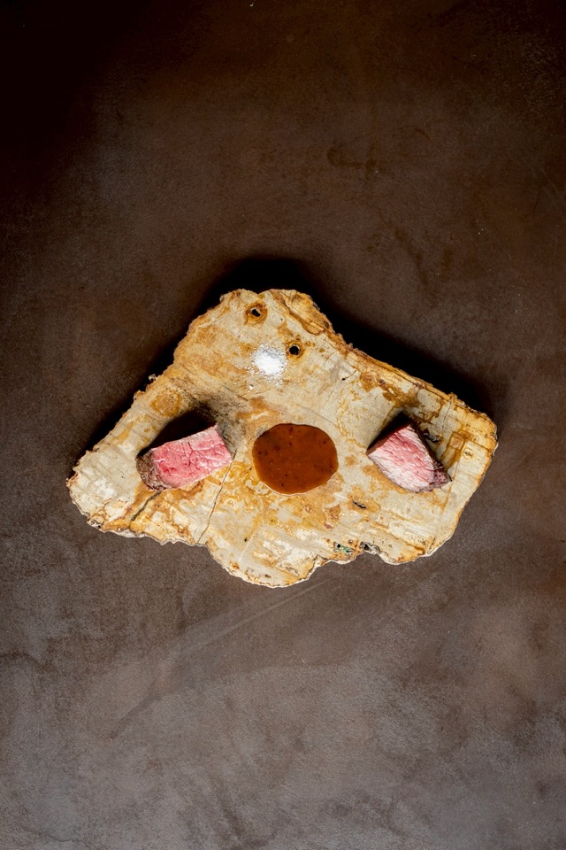 [Two wood-fired main dishes: Wagyu beef and a monthly meat dish]