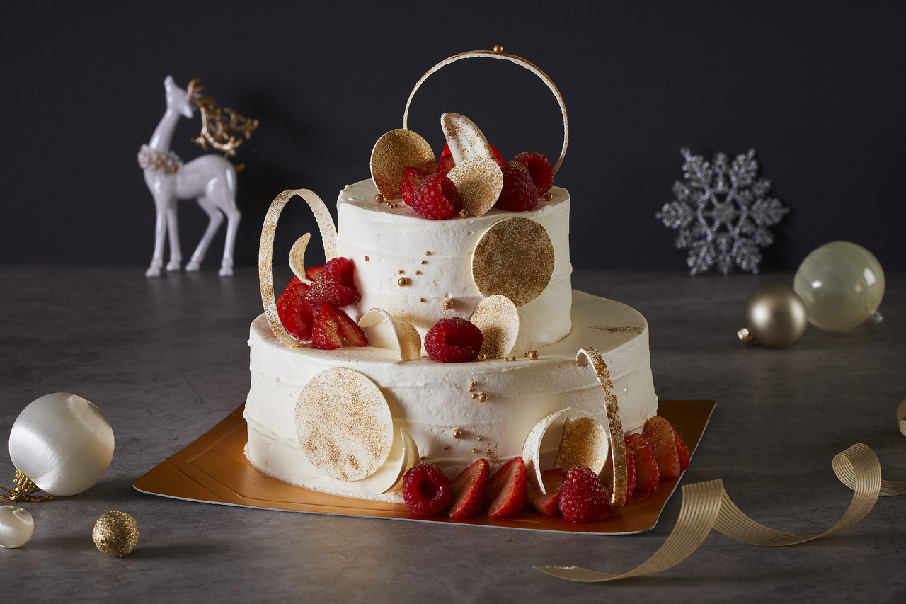 This special two-tiered shortcake features a moist sponge cake and melt-in-your-mouth fresh cream. The elegant strawberry and raspberry decorations with sparkling white chocolate add a touch of Christmas charm, making this a truly memorable treat.
