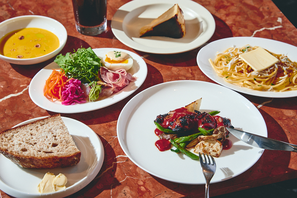 APPETIZER Salada Buffet & All You can Drink PASTA Whitebait and dried mullet roe pasta with fermented butterMAIN DISH Grilled black pork shoulder with BBQ sauce or Foie gras and black beef caillette (+¥600)DESSERTS Basque cheesecake + truffle (¥500) TEA / COFFEE OPTION +300Homemade bread with fermented butter