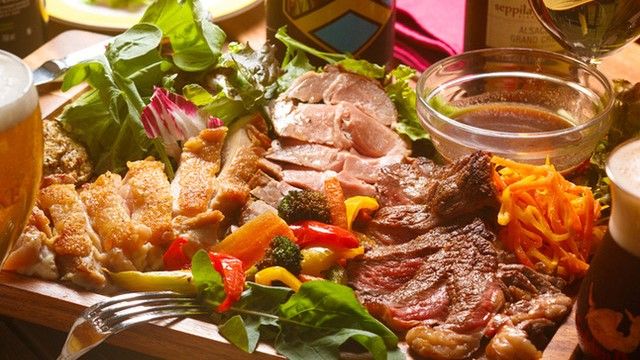 グランドメニューは、軽いおつまみ、絶品のパテやハム・サラミの盛り合わせ、肉や魚を使った冷・温菜、新鮮な国産野菜のサラダ、肉や魚のメイン料理、ムール貝や3種のチーズ盛り合わせ、ワンプレート、ホットサンド、パスタ、デザートとランチにも対応した料理も豊富です。コースは鶏、豚、牛のお肉盛り合わせをメインに、樽生ベルギービールが飲み放題でプラス。テラス限定のコースはイベリコ豚のグリル料理がメインです。