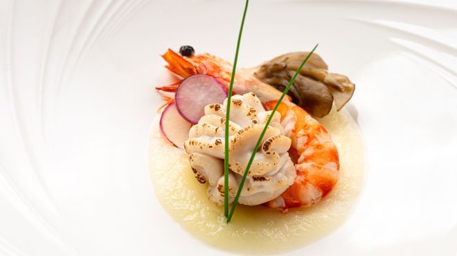 店内に足を踏み入れると、黒を基調とした落ち着いた空間が広がっています。テーブル席と夜景が楽しめるバーカウンターの2種類の座席をご用意していますので、お客様がお好きな席で料理を楽しんでいただけます。美味しい海老料理を堪能したい方のために、天然車海老のリゾットをはじめ海老カツサンド、海老のアヒージョなど様々なメニューをご用意。カクテルや焼酎、ワインなども多数取り揃えておりますので、料理と一緒にお楽しみください。