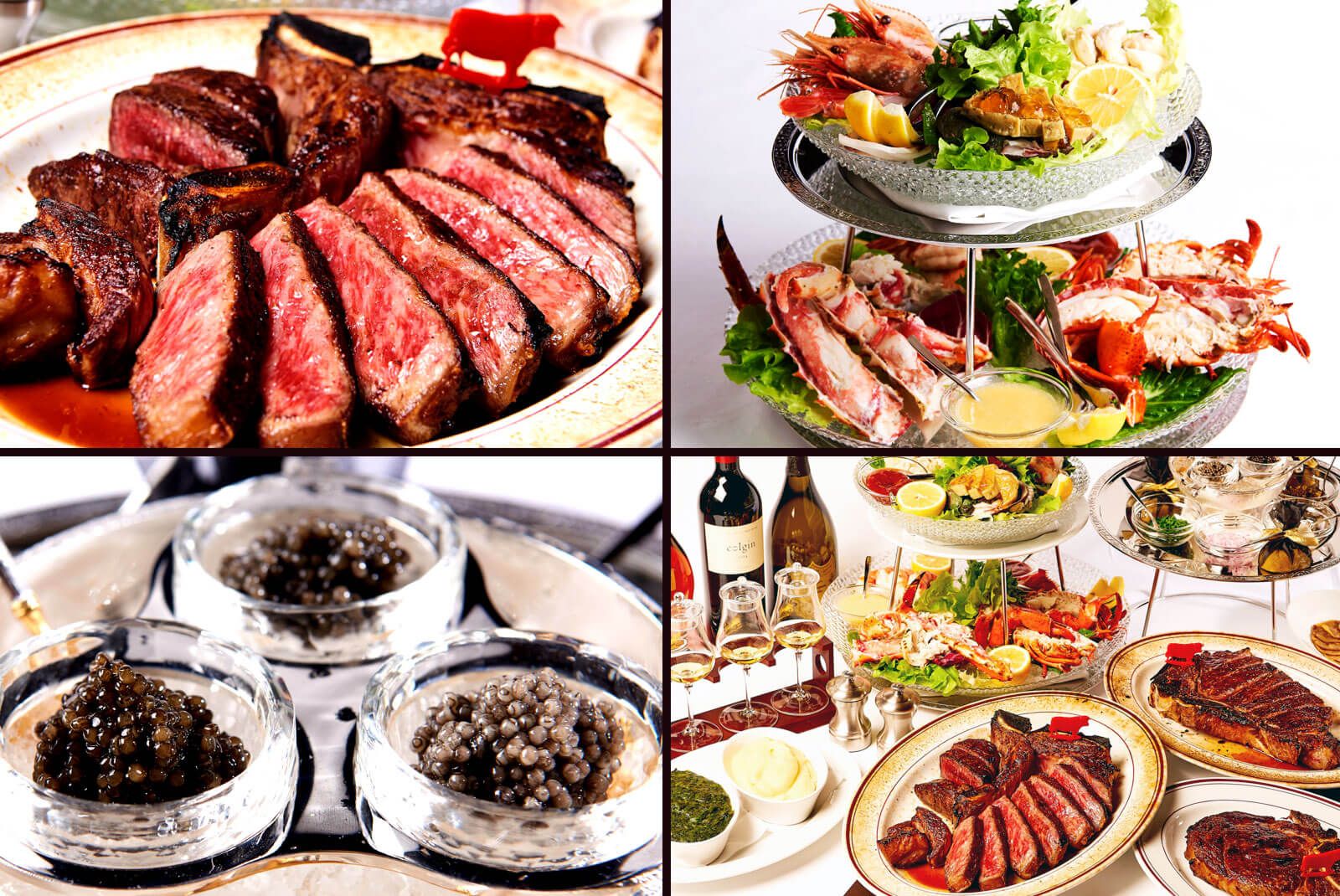 天井には大きなシャンデリア、テーブルクロスや革張りのソファーなど格調の高いエレガントな空間が極上の時間を演出します。 アメリカ農務省の格付けで最上級の品質と認定されたプライムグレードの牛肉を、専用の熟成庫で約28日間熟成させて旨味を引き出します。900℃のオーブンで焼き上げた迫力ある厚切りのステーキをお楽しみください。ステーキ以外にも世界各国のワインやシーフードメニュー、アペタイザー、サイドディッシュなど豊富に揃えています。