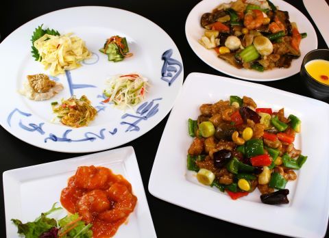 ◼︎Assorted 5-piece Appetizer Platter ◼︎Seasonal Vegetables and Shrimp Stir-fried with XO Sauce ◼︎Spicy Eggplant and Potato Stir-fry ◼︎Mapo Tofu in a Clay Pot ◼︎Dalian Fried Rice ◼︎Angelic Almond Tofu