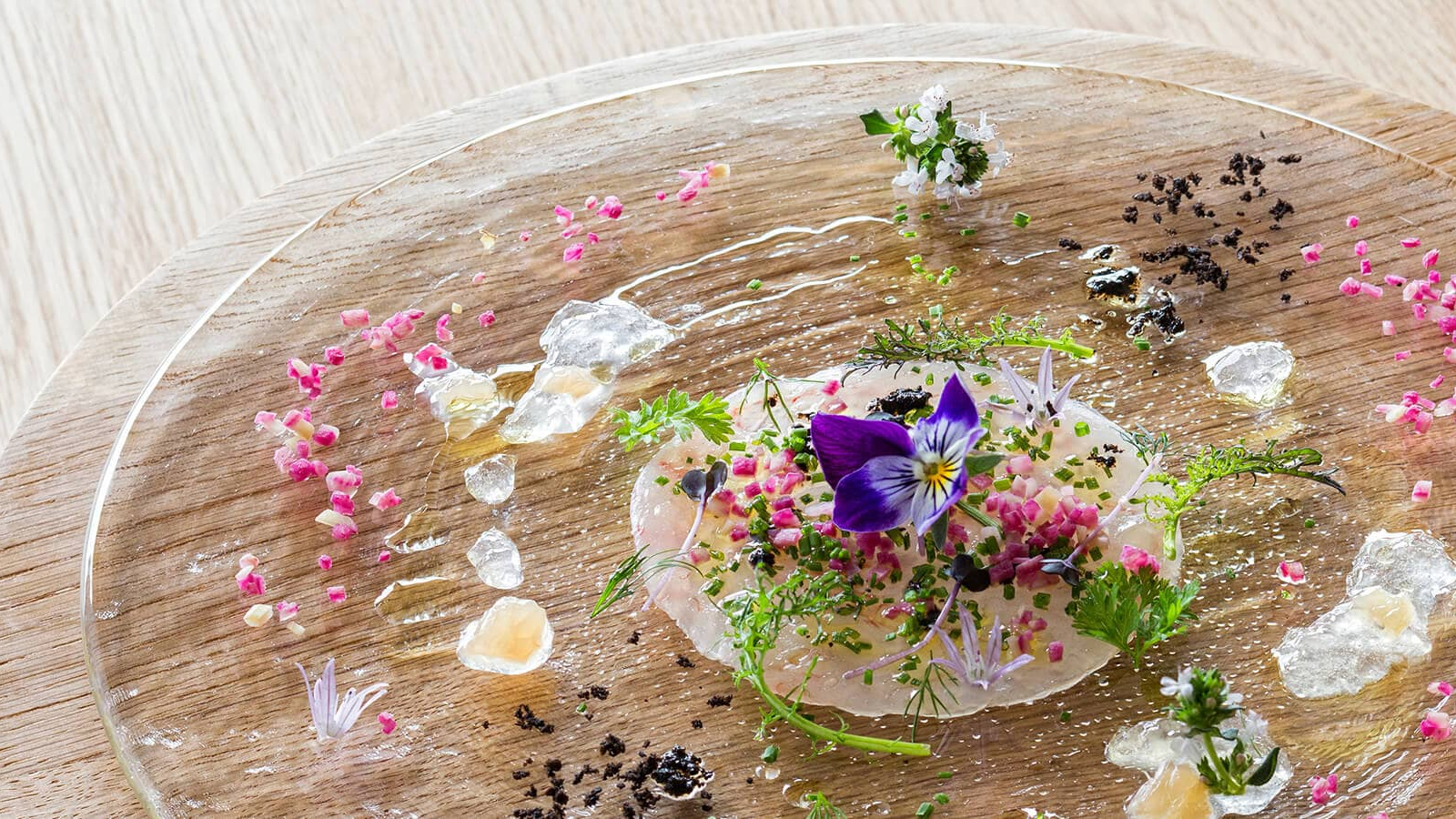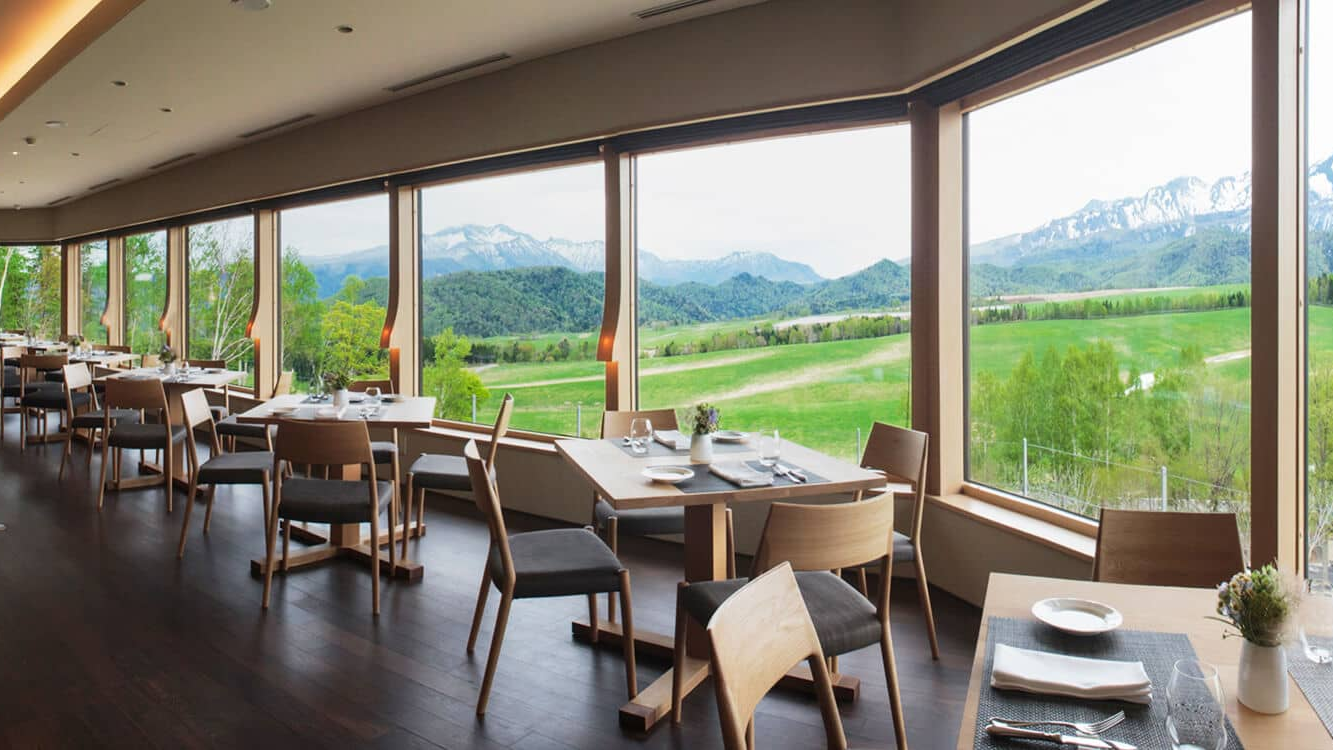 丘の上に立つ店からは、季節によって雰囲気の変わる大雪山と農業者の上質な食材作りへのこだわりが垣間見える牧草地や畑が一望できます。店内でも、そのような景観から分かる土地の美しさを感じてもらえるよう、家具は地元木材を用いたもので揃えています。料理は、地元の旬な食材を使った肉料理や魚料理、野菜、デザートなど様々な形のものを提供しております。豊かな景色とともに、この土地の恵みを味わえる料理の一品一品をご堪能ください。
