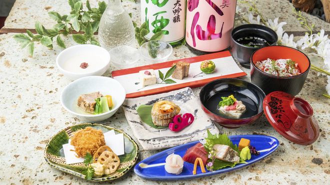 店内に入ると、和を基調とした洗練されたインテリアと内装がお出迎え。本格的な和食を楽しみたいという方に最適なメニューがたくさんございます。黒毛和牛の石焼き、岩手県産岩中豚ロースのグリルといった肉料理や、魚料理も金目鯛の煮つけや鮑のソテーを用意しています。耐火性の高い土鍋で食べるご飯は、体が温まります。料理と共に全国から選び抜いた日本酒と国産ワインもお楽しみください。