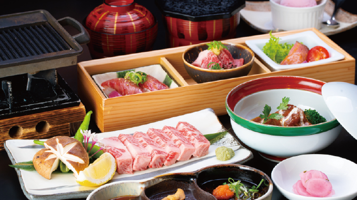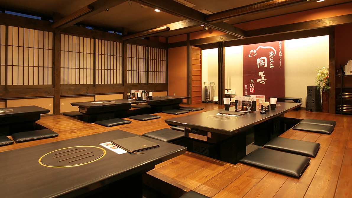 岡喜牧場直営のため上質な近江牛を提供しています。こだわりの食材を最高の料理で提供し、特別な時間を楽しく過ごせるお手伝いをいたします。本店1Fではテーブル席や掘炬燵席、小部屋をご用意しております。2Fには大広間から小部屋まで、様々な形態でのご利用が可能です。ゆっくりとお料理を楽しめる懐石から、気軽に楽しめる定食まで様々なメニューを取りそろえております。また、お子様メニューもご用意しております。