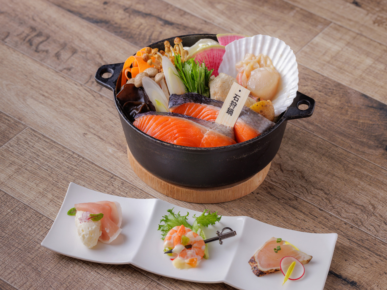 Chitose Hotpot's seafood course uses ingredients from Hokkaido dipped in the hotel's original broth and served shabu-shabu style. It's a new type of hot pot dish that can be enjoyed by individuals or groups.